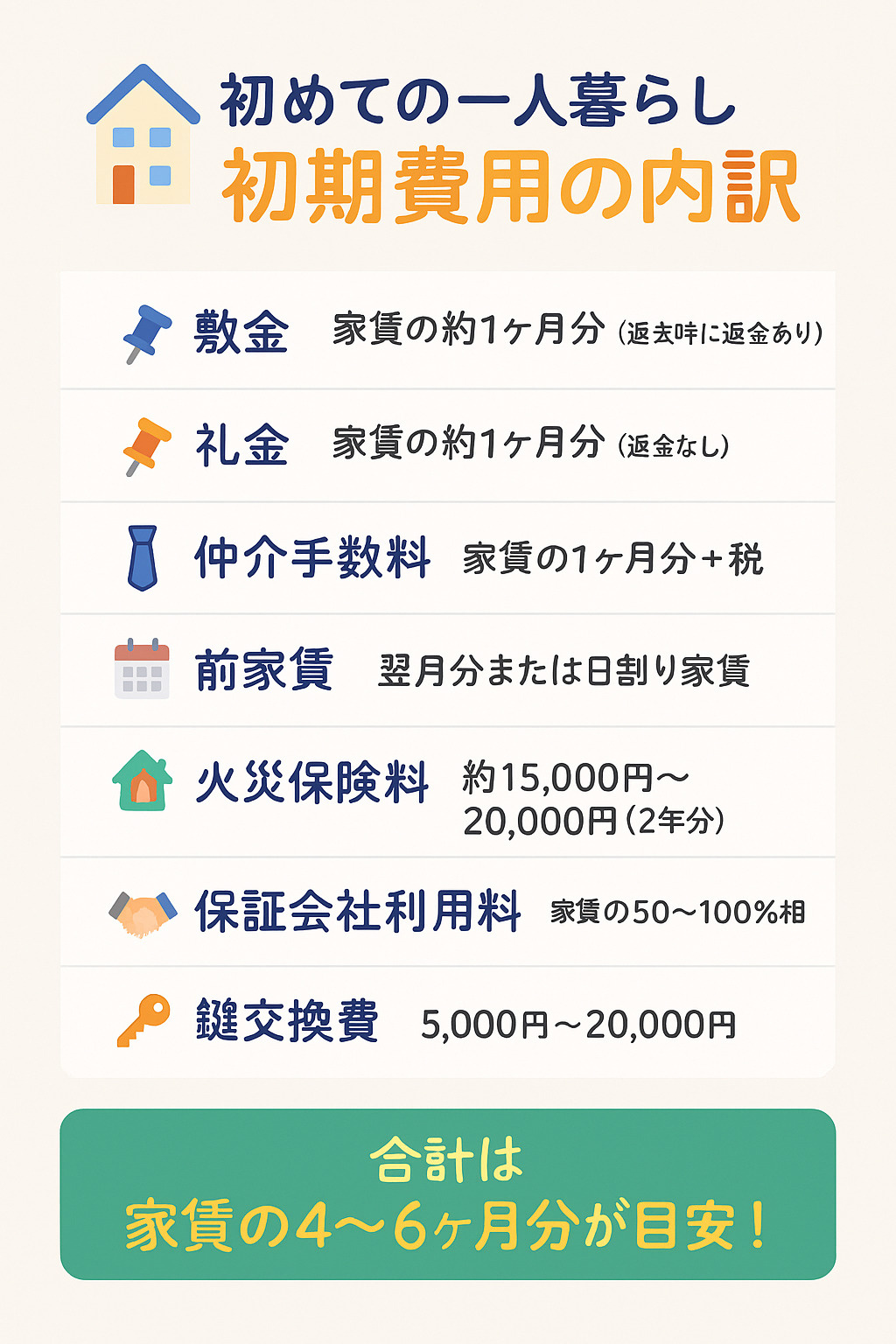 以上が初めての一人暮らしにかかる初期費用の内訳です。
